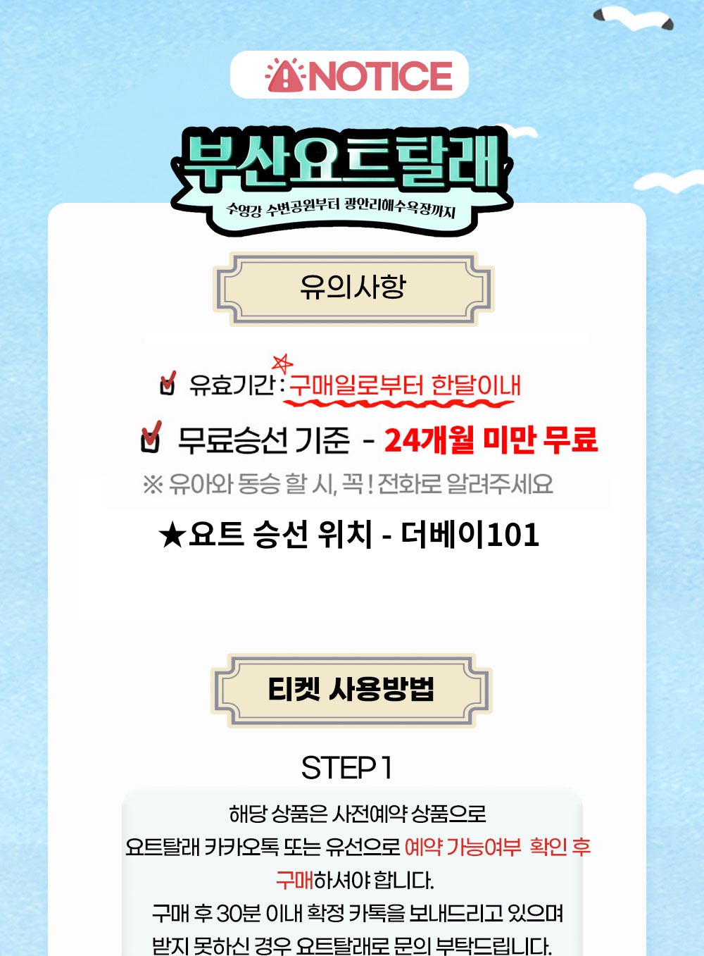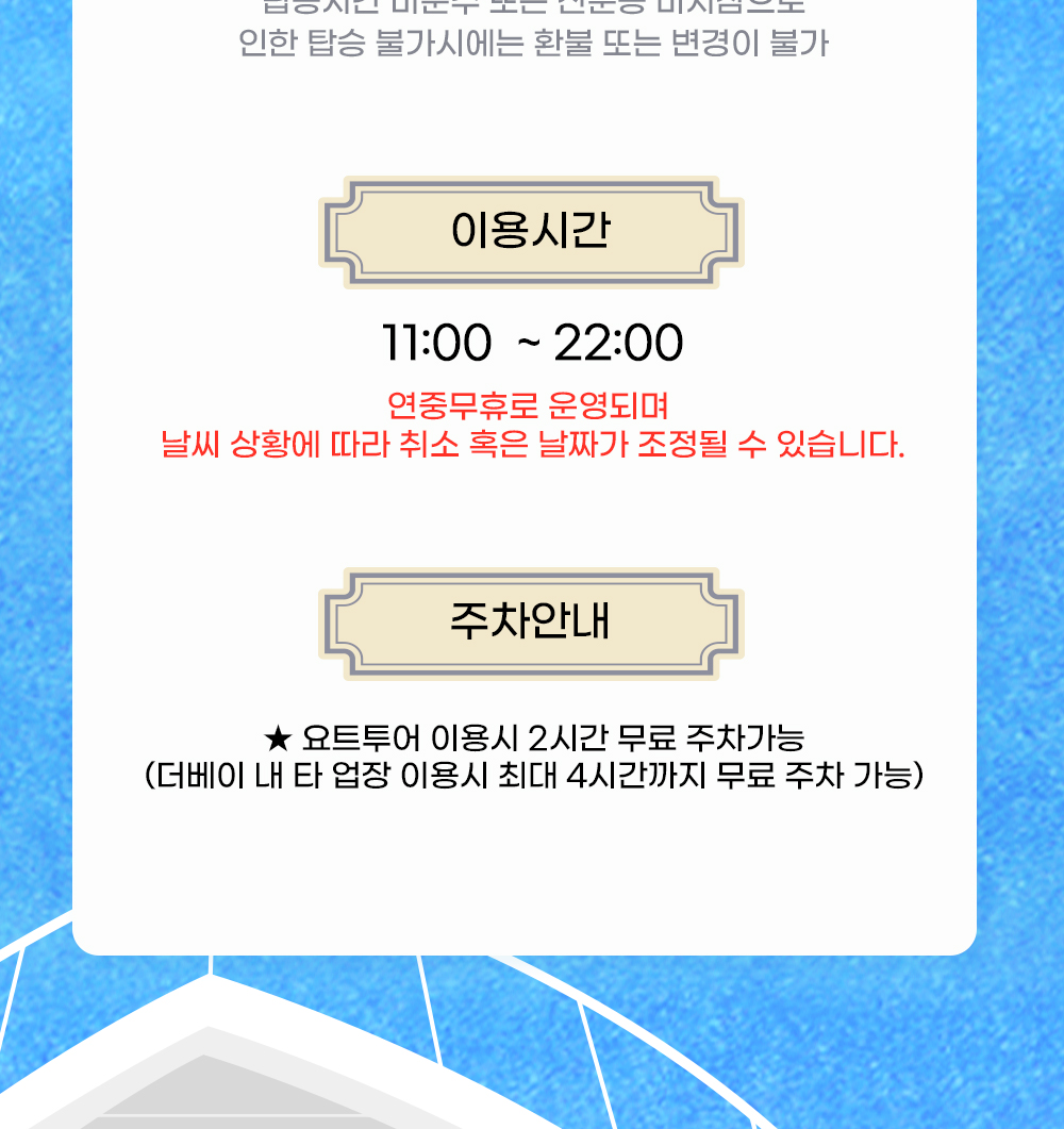 ※ 기상청 발표 기상악화(풍랑 주의보 / 태풍 주의보 호우 주의보 등)로 인한 취소시에는 무료 일정 변경 해드립니다.