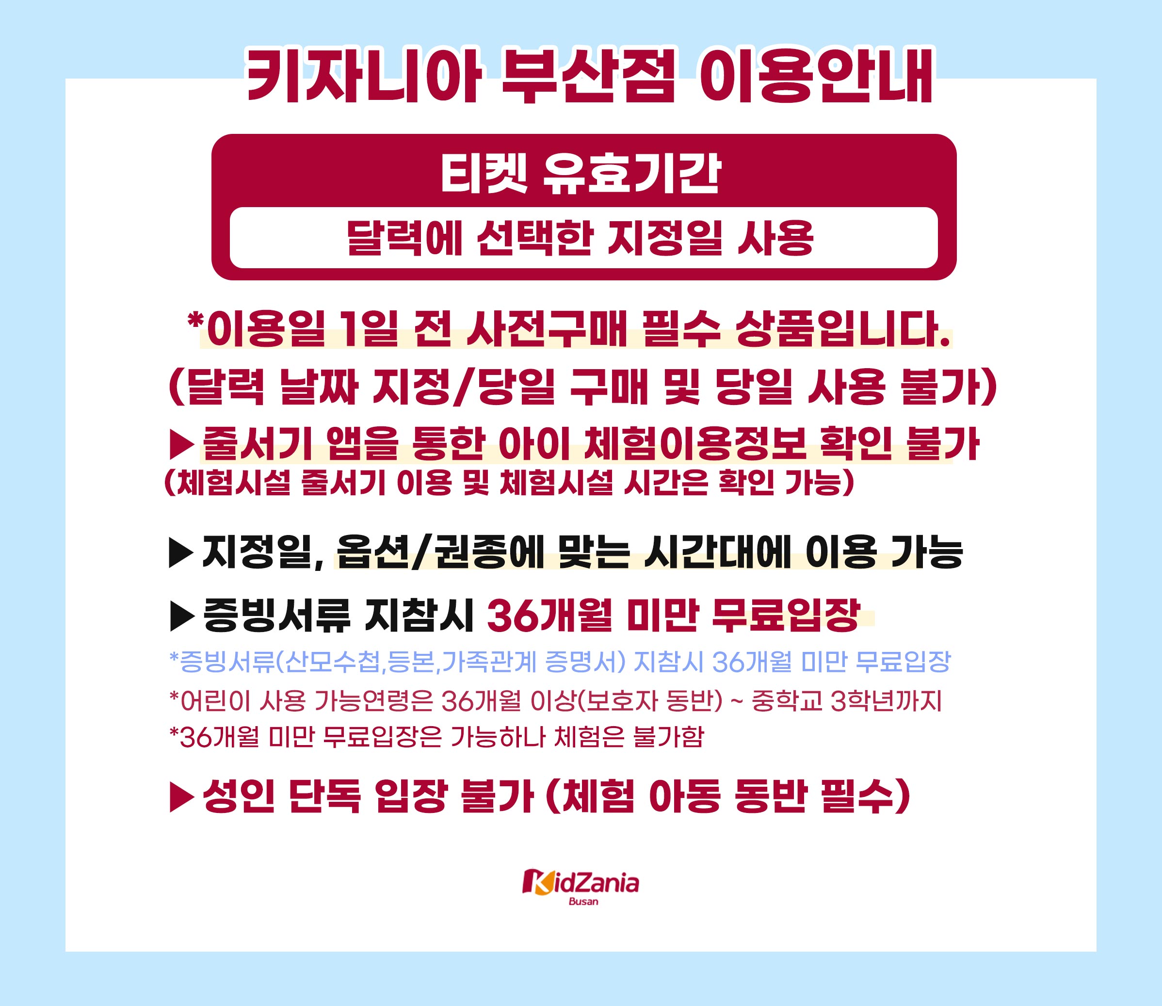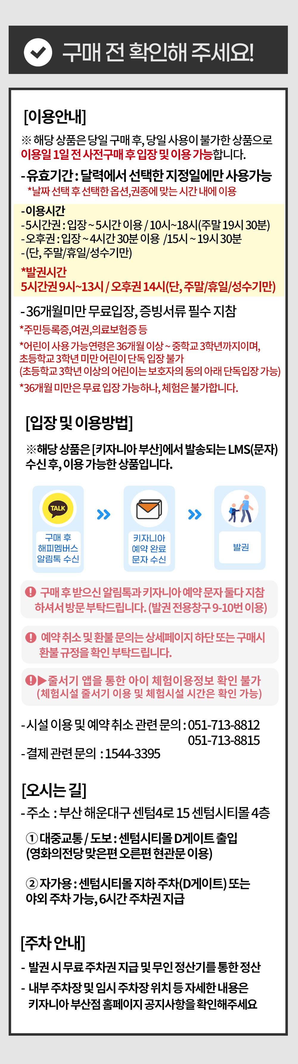 - 구매 후 키자니아 부산점에서 예약 완료 문자가 발송되며, 해피멤버스 안내 카카오톡 및 키자니아 예약 문자 둘다 지참 후